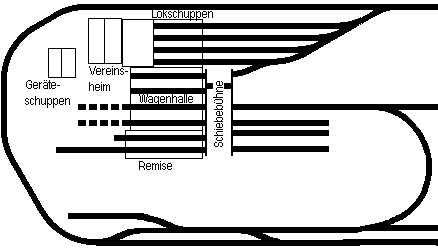 Von unserem Rundkurs zweigt das "Gleisdreieck" ab, welches das Drehen einer Dampflokomotive ermöglicht, wie wir sie zu verschiedenen Anlässen zu "Besuch" haben, und zugleich den Anschluß an die Verladerampe herstellt. Die Verladerampe befindet sich außerhalb des eigentlichen Vereinsgeländes und ermöglicht es unseren "Gastfahrern" ihre Lokomotive einfache vom Transport-Anhänger zu Entladen und nach einer Veranstaltung ebenso einfach wieder zu laden. Der Bahnhof ist auf 2-Zug Betrieb an speziellen Fahrtagen (z.B. Pfingsten) eingerichtet, so dass ein reibunsloser Verkehr gewährleistet ist. Durch seinen Anschluss an die Schiebebühne kann auch eine weitere Zuggarnitur bereitgehalten werden. Als Werkstatt und Lokschuppen dient eine alte Wellblech Doppelgarage mit 2 x 2 Gleisen. Als letztes, fünftes Gleis der Weichenstraße zweigt die Zufahrt zur Schiebebühne ab, die es uns möglich macht kürzere, 2-achsige Wagen auf die Gleise der Wagenhalle, der Remise und die gegenüber liegenden "Schau-Gleise" zu verschieben. Zwei weitere Wellblechgaragen dienen als Geräteschuppen und als Vereinsheim, welches bei Veranstaltungen als Küche herzuhalten hat und auch bei schlechterem Wetter ein gemütliches Zusammensein ermöglicht. Sie sind herzlich eingeladen auch ihre Feier (z.B. Geburtstag) bei uns abzuhalten und zwischendurch immer mal wieder eine kleine Runde auf der Feldbahn einzuschieben. Setzen Sie sich dazu bitte mit unserem Herrn Eckhard Schulz in Verbindung. |